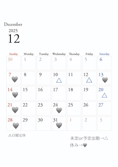 12月の出勤予定日載せとく!! 基本出勤で(何もついてないところは出勤!) 🩶はおやすみ △はおやすみか事前に連絡があった時だけ出勤するか、遅出勤、又は早帰りの日! 🩶の日は旅行に行くから確実におやすみだけど△の日はわからないから来てあげてもいいよって方ははやめに私に連絡ください🙇♀️🤍‼️ いっつもゆるゆるだけど 本当来月だけは頑張りたい!!です!! お力添えよろしくお願いします😿🩵🩵 ちひろ