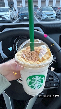 おは!! スタバの新作のシュークリーム フラペチーノのんだ!!!🩶🤍🩵 甘かったけどおいしかった!!✊🏻 自分へのご褒美!!!🎶 明日入園式がんばるまん!!😼👍🏻 またあしたー!!今日はお休み!! キャンキャン うな
